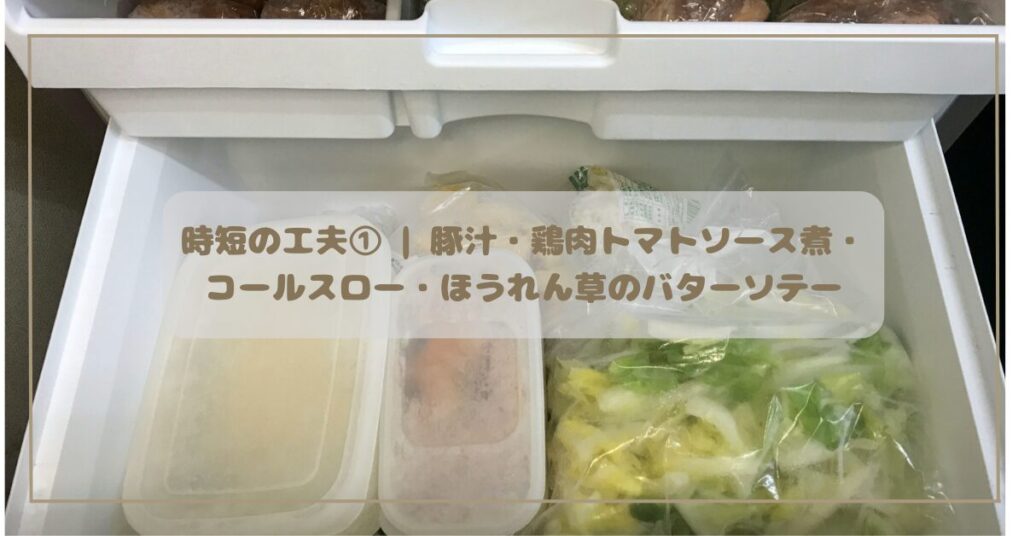 時短の工夫① | 作り置き | 豚汁・鶏肉トマトソース煮・コールスロー・ほうれん草のバターソテー