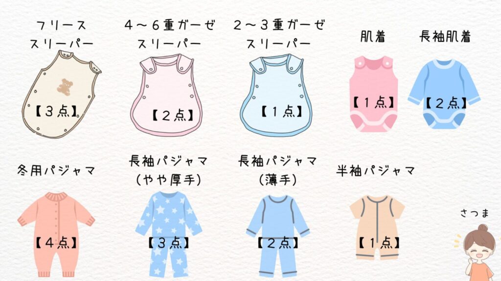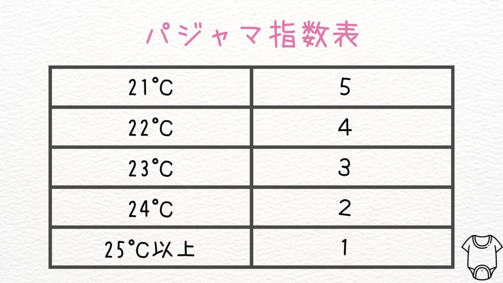 「さつまいもママのブログ~赤ちゃんとの生活を快適に~」から室温で決める!赤ちゃんの寝るときの服装マニュアル(春夏秋冬)(https://oimoho9ho9.com/pazyamamyuaru/)を参考にするとよいと思います。