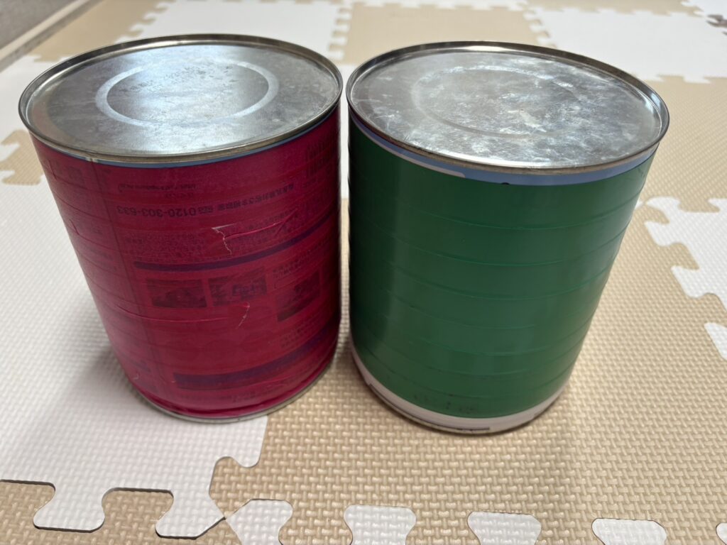すごくシンプルなデザインですが、かれこれ1年くらいはこのミルク缶で遊んでいます。実はこのミルク缶太鼓になる前は、プラスチックのフタに穴を空けて物を落とす教具としても活躍していました。今は底の金属の部分を叩いて、太鼓として楽しんでいます。